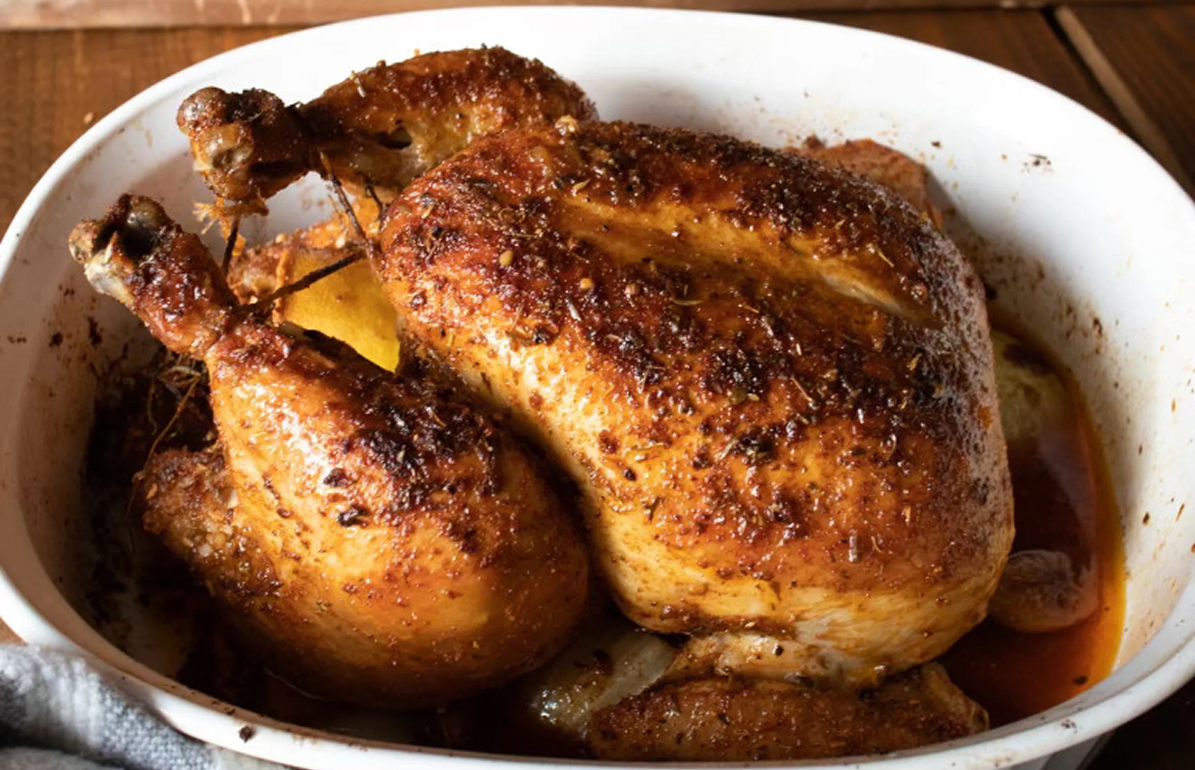 Place the chicken on a rack in a roasting pan. Generously season with spice mixture, drizzle with olive oil, and stuff with half a lemon, fresh thyme, and rosemary.
